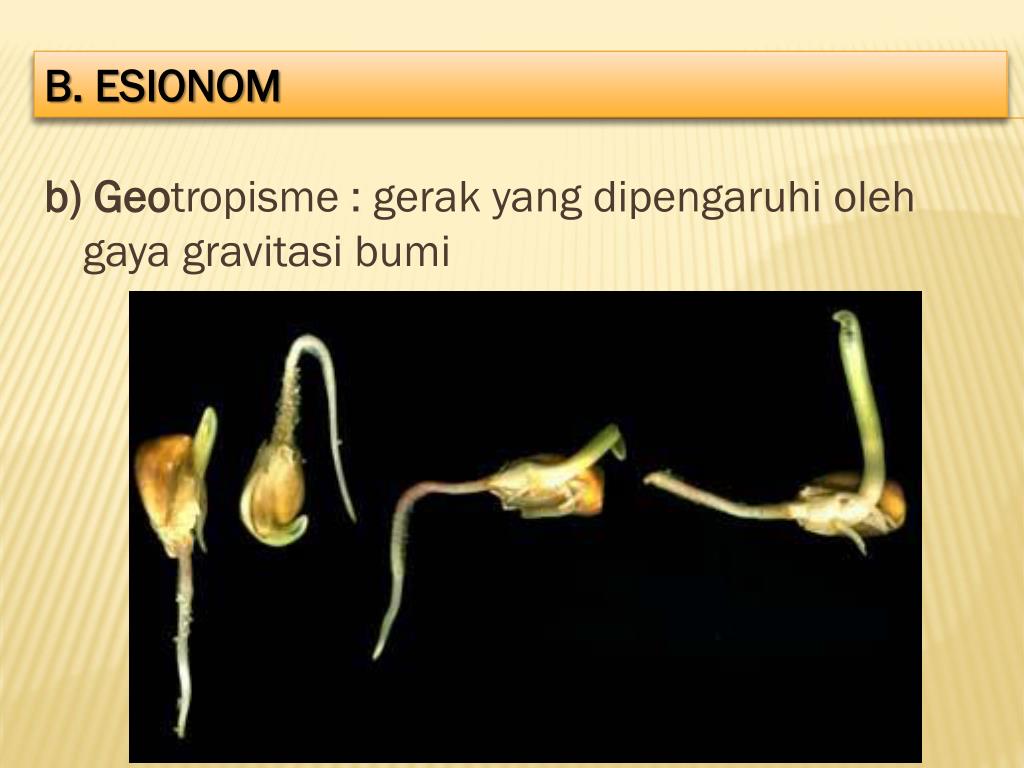 Contoh gerak autonom antara lain sebagai berikut. Diduga gerak yang terjadi disebabkan oleh rangsangan yang berasal dari dalam tumbuhan itu sendiri. Gerak etionom merupakan reaksi gerak tumbuhan yang disebabkan oleh adanya rangsangan dari luar. Based on its stimulus,the movements in plant are grouped into three, Menjadi tiga,yaitu gerak autonom(endonom),gerak esionom,dan gerak higroskopis.